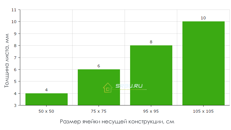 لهيكل الصلابة الداخلية تأثير كبير على خصائص قوة اللوحة. يجب أن يؤخذ هذا الظرف في الاعتبار عند تحديد سمك الورقة الأمثل وميزات تصميم المظلة. يظهر الرسم البياني أدناه اعتماد سماكة ورقة البولي الخلوي ، على حجم الخلية للخراطة على المظلة.