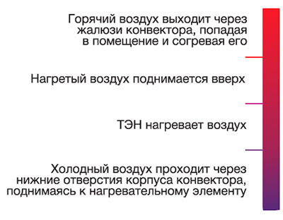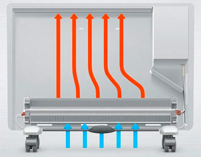 Електрическите уреди от този тип имат нагревателен елемент, нагрят до висока температура, което отдава топлина на въздушните потоци, издигащи се по стените му. По време на работа на такова устройство възниква достатъчно интензивна циркулация на въздушните маси, което води до бързо нагряване на помещението.