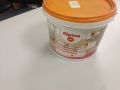 Quero fazer reparos de uma vez por muito tempo, por isso decidimos não economizar e comprar materiais da mais alta qualidade. Para pintura de papel de parede (temos uma base não tecida) e tetos, foi comprada a tinta Alpina Premiumlatex 7. O material é caro, mas devido ao seu baixo consumo, ele se paga. Eles pegaram uma lata de 10 litros, misturaram com uma cor bege e, como resultado, essa quantidade foi suficiente para uma superfície com uma área total de 200 m².